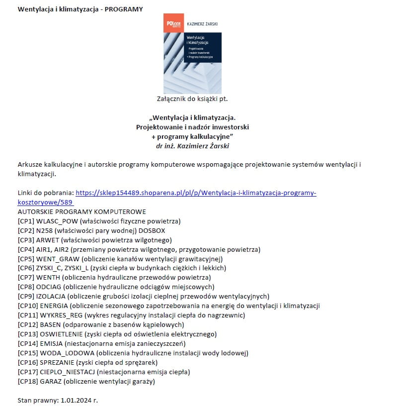 Wentylacja i klimatyzacja - programy kalkulacyjne - poniżej